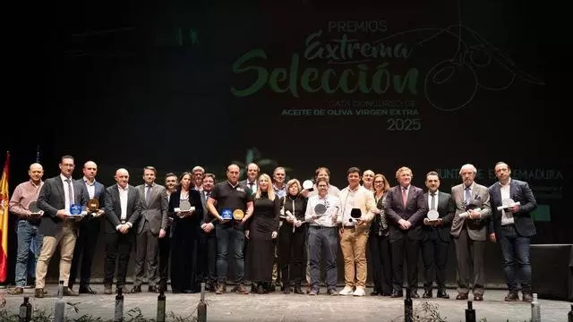 Premiados y autoridades, ayer, en el teatro López de Ayala, tras la entrega de Pemios Extrema Selección Cata Concurso de Aceite de Oliva Virgen Extra 2025. / Andrés Rodríguez