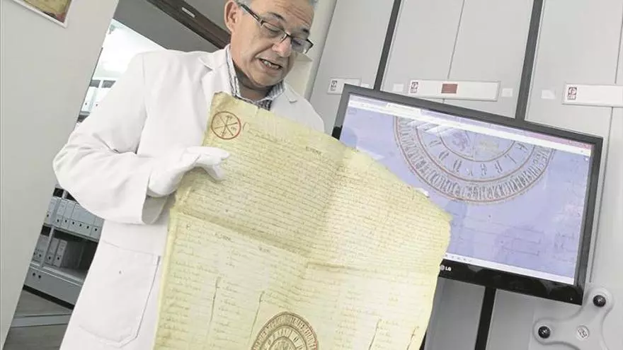 FONDO MEDIEVAL / Y seguidamente, en 2014 comenzó la segunda fase: la digitalización de los fondos y su incorporación a la web. Primero se subió la sección más sensible, la más delicada, especialmente valiosa y demandada por los investigadores: el Fondo Medieval. «Consta de 145 documentos, la mayoría en pergamino, que van de 1258 a 1535», precisa el historiador. Hay auténticos tesoros, como una carta plomada de Fernando IV que concedía a Cáceres las rondas de la villa en 1303, o un acta del juramento de Isabel la Católica en el Arco de la Estrella (1477), prometiendo guardar los fueros, privilegios y libertades del concejo, y aprobando sus ordenanzas.
