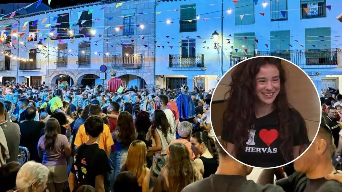 Cristina con su camiseta de "I love Hervás' y una imagen de las fiestas de Hervás de fondo.