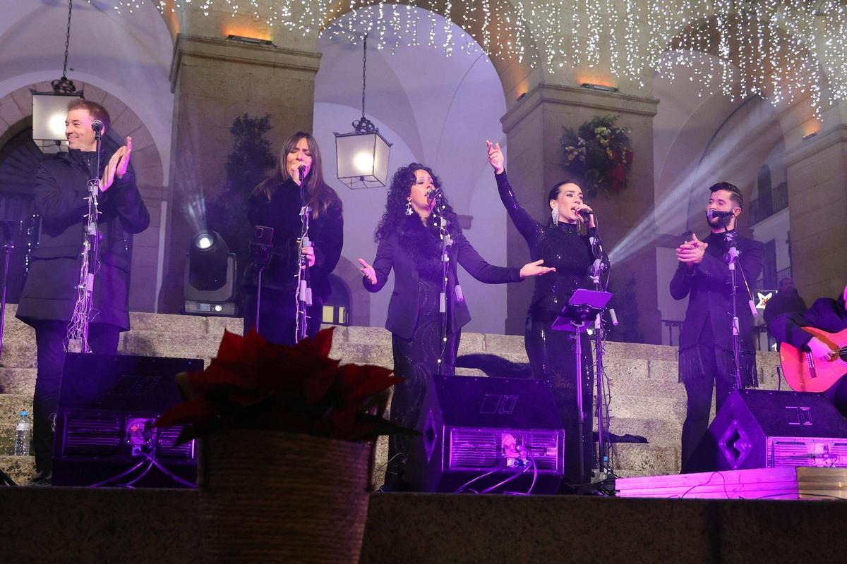 El grupo Zambomba Almariz, con diez músicos y una bailaora sobre el escenario, fue el encargado de llevar la música y el ambiente festivo a la plaza cacereña