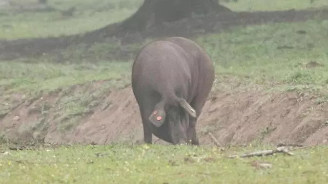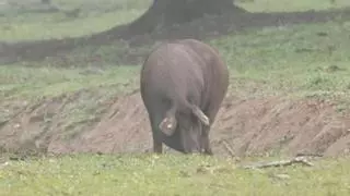 Cerdo ibérico alimentándose en la dehesa extremeña.