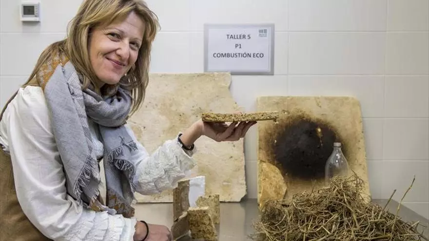 Todo empezó porque a esta conquense le gustaron las Fallas. De esas cenizas surge este hormigón. «Fui a estudiar a València y me gustó el mundo de las fallas, el ambiente, la mascletà… pero me llamó la atención el humo negro de la cremà. Le decía a mis amigas de la universidad ya sé porque no las queman de día, porque sería una barbaridad. Viendo esas columnas negras pensé en cambiar el poliestireno expandido por un material más sostenible, como cuando eran de cartón piedra, y entonces pensé en la paja de arroz, que es también un problema para València», explica.